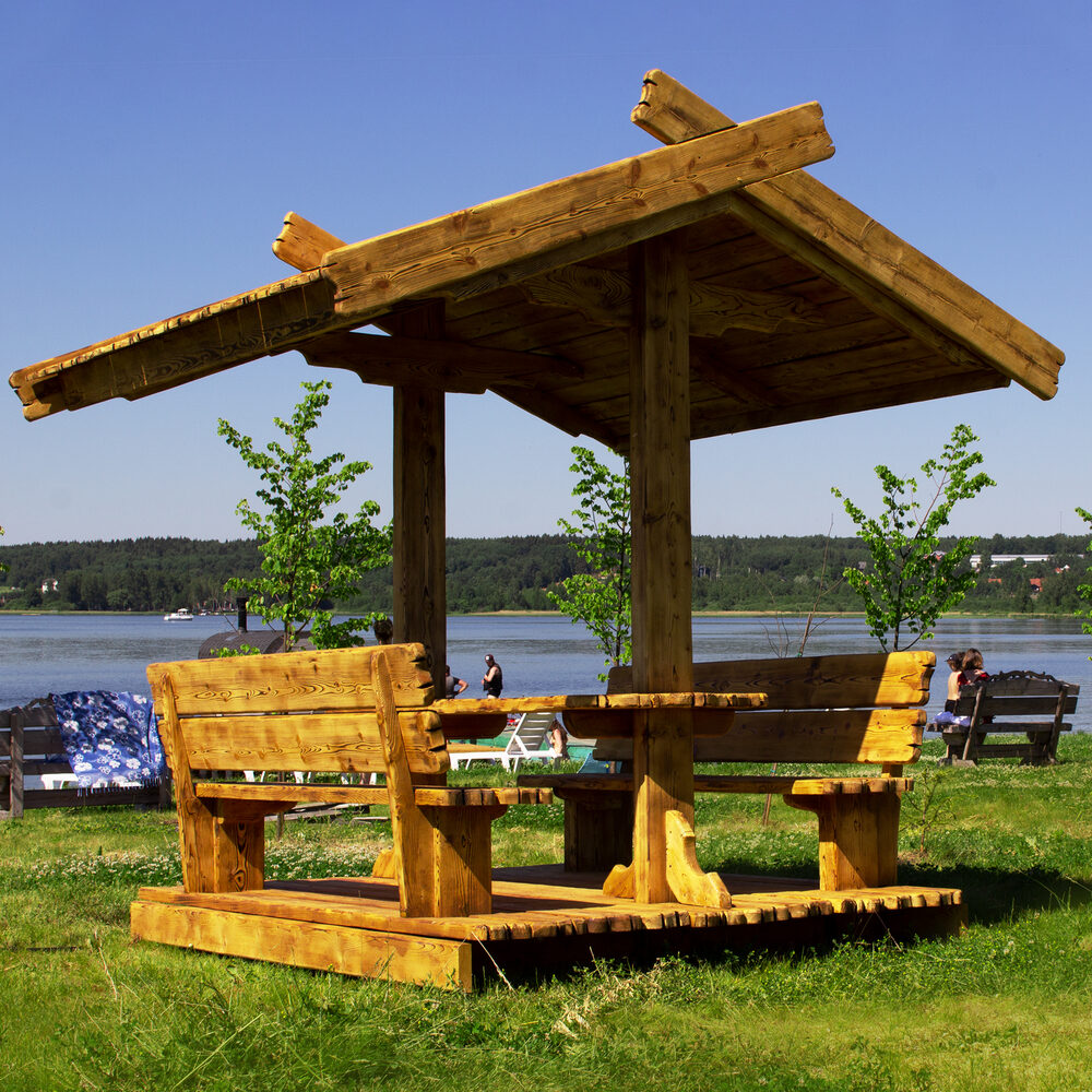 Маленькая удобная беседка вместимостью 6 человек со столом и скамейками на берегу Икшинского водохранилища.