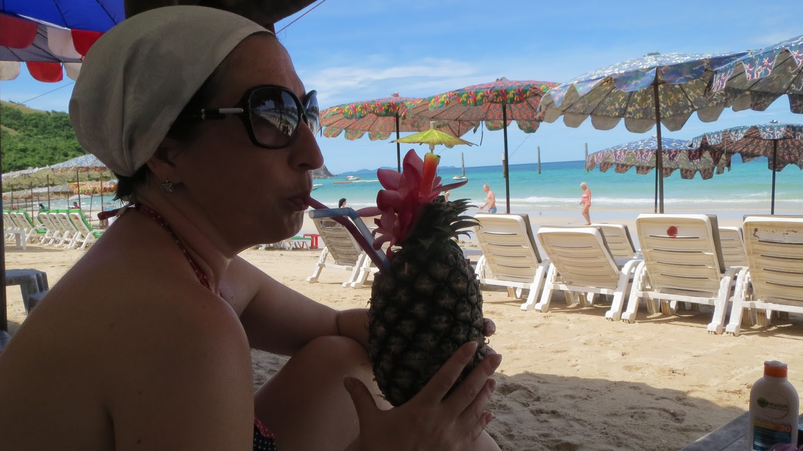 На каждом кусочке есть своя лавочка с купальниками, полотенцами, панамами, надувными кругами и т.п. и обязательно кафешка. На троих едим примерно на 500-750 бат. Готовят хорошо. Коктейли веселые делают. "Пиноколаду" прямо в кокосе, еще и цветами украсят, "Майтай" приносят в ананасе.