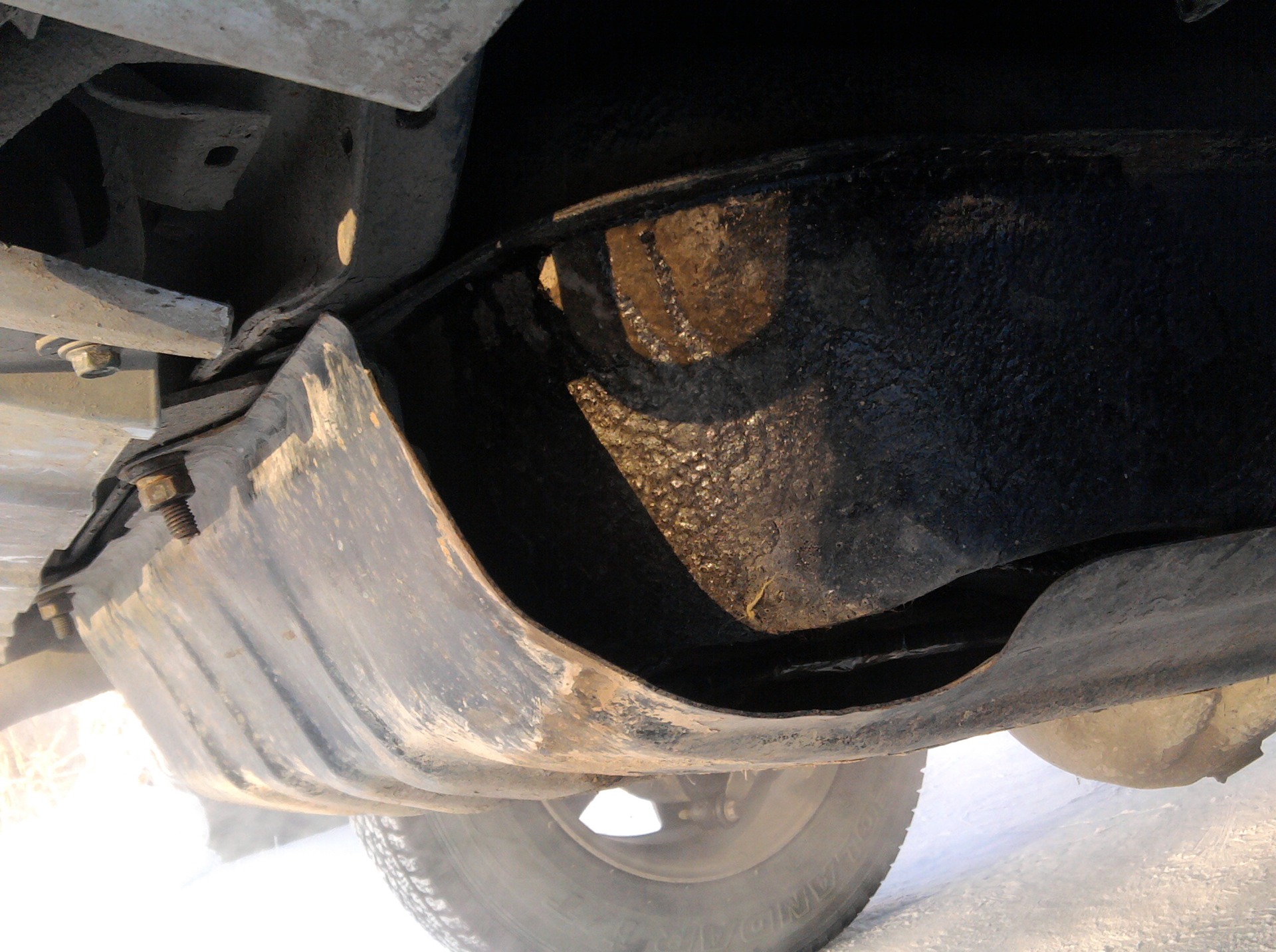 Полазив под машиной, огорчило, что с правого переднего колеса отлетел колпачок штуцера прокачки и вытекла тормозная жидкость. Также увидел, что отколовшиеся куски диска, перемещаясь под днищем, надорвали пыльник правой шаровой, затем один из них (или арматурная подставка дорожного знака) ударился об кронштейн крепления стабилизатора поперечной устойчивости и погнул его (кронштейн), потом на заднем мосту задел сапун (шланг вентиляции картера редуктора), перерезав его частично посередине.