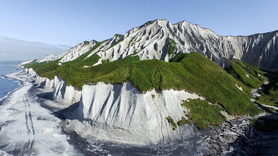 Белые скалы - потрясающее творение стихии в природе. Растянутые на 28 километров вдоль побережья Охотского моря на острове Итуруп горы, состоящие из мягкой пемзы образованной после извержения вулкана, поражают своей красотой. Особенное очарование этому месту придаёт изумрудная зелень, которая обрамила образовавшуюся композицию. Пемза претерпела сильную эрозию под воздействием штормов Охотского моря, дождей и многочисленных малых рек и ручьев, которые в итоге сформировали причудливые и изумительные формы скал. Песок прибрежной полосы смешанный: белый кварцевый и черный титано-магнетитовый. Наверное, от их соединения образуется его непривычный темно-серый цвет.
