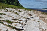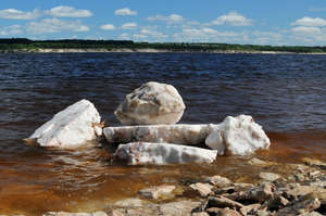 Мы немного прогулялись вдоль берега в районе деревушки Почтовое. И вот, что там увидели. Левый берег реки пологий — гипсовые породы прямо в открытом виде тянутся вдоль воды. Порой кажется, что это не природный пейзаж, а остатки рукотворной набережной — берег словно выложен белоснежными плитами.