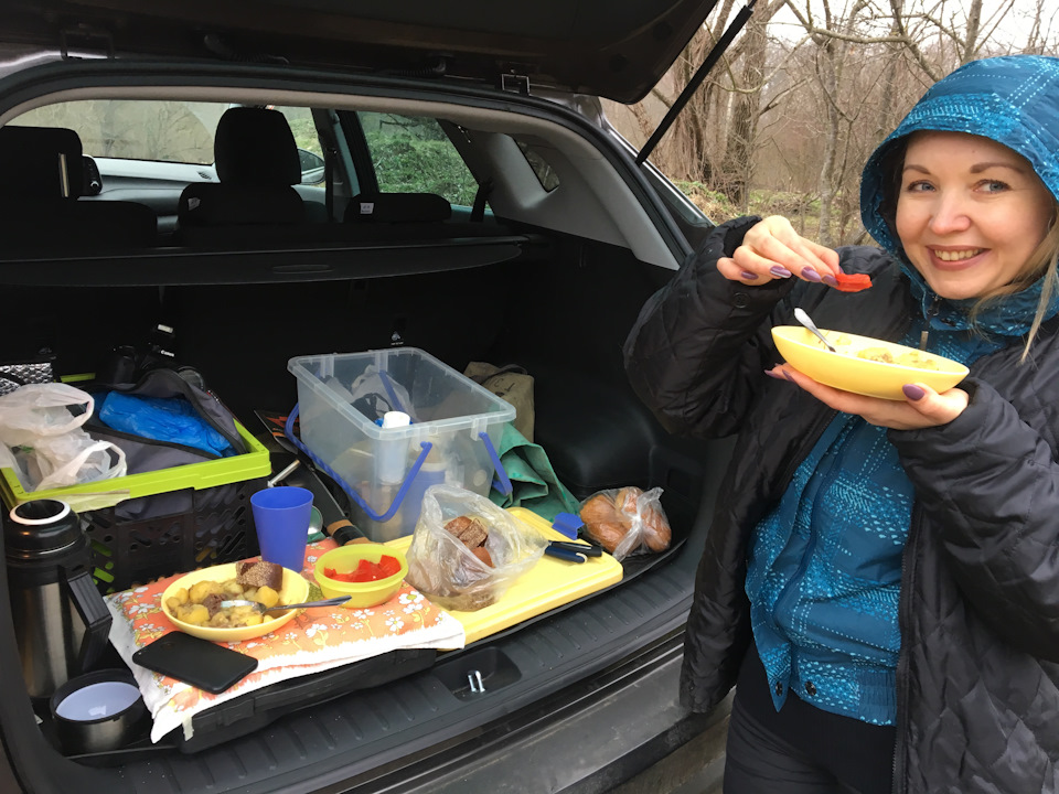 Столик и кресла брать не стали. Сидеть зябко. Расположились стоя у багажника, вполне комфортно.