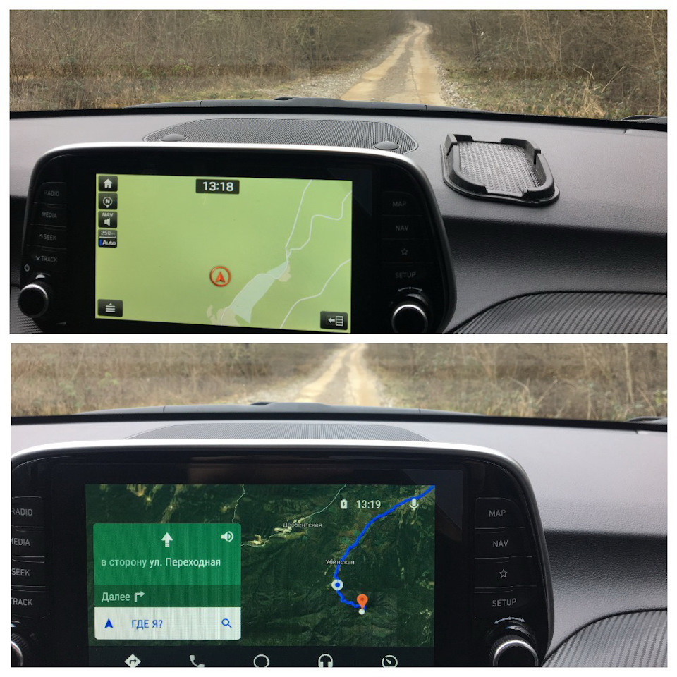 В тех местах, где проселочные дороги не нанесены на карты, штатная навигация Tucson помогает слабо. Удобней пользоваться спутниковой картой через android auto.