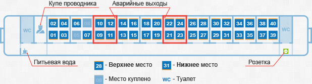 Будет отображена схема, которую мы привели чуть выше, на которой свободные места будут выделены голубым цветом. Старайтесь выбирать места, расположенные не у туалета, а в случае плацкарта - не боковые. Также отметьте галочкой потребность в постельном белье.