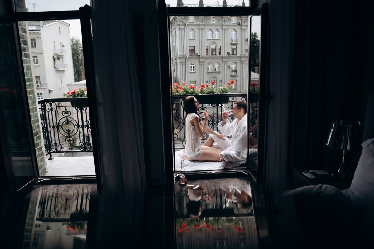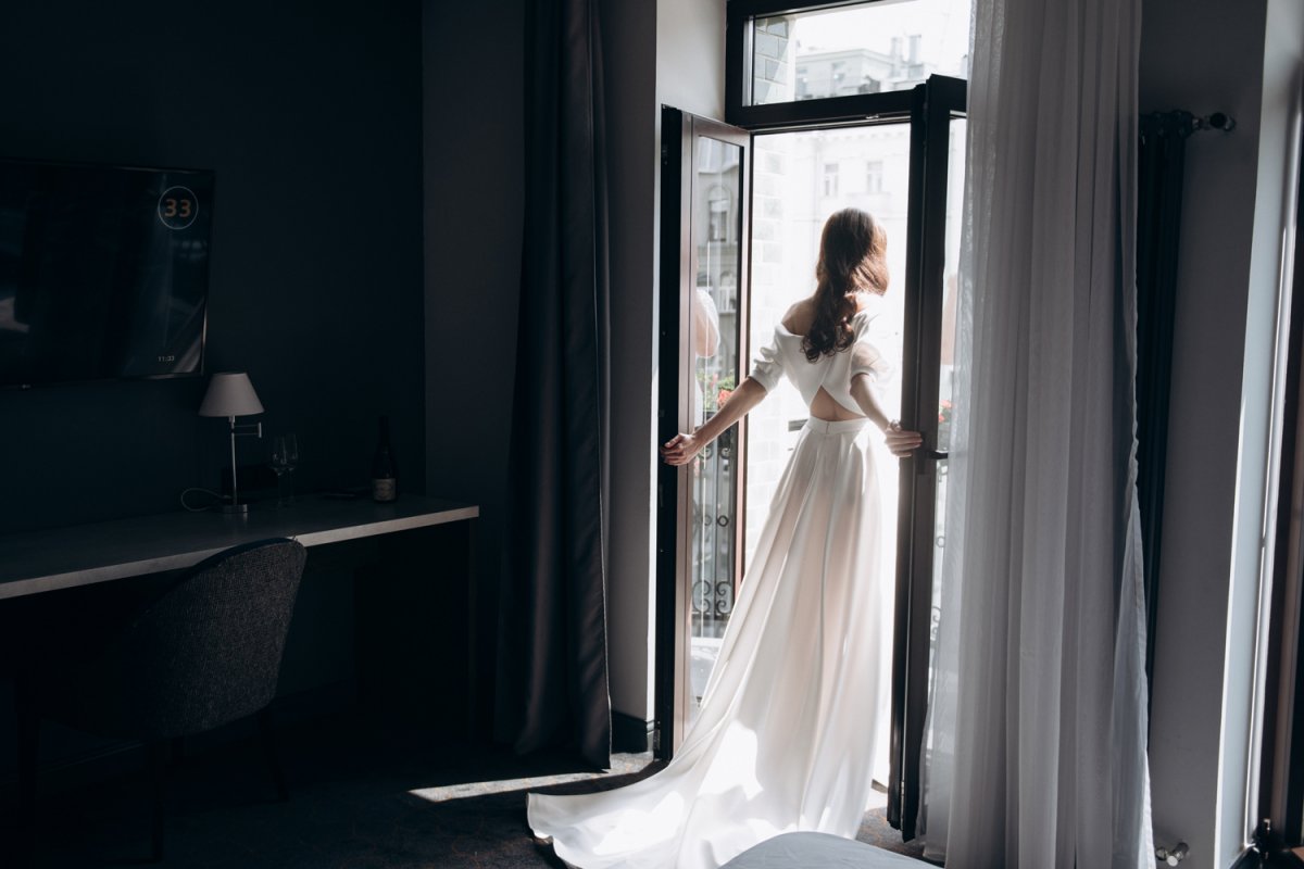 Чаще всего у нас утро невесты происходит совместно с женихом. Пара заселяется заранее в отель, утром приезжает стилист для невесты, жених в это время может спать или завтракать. Однажды жених даже смотрел футбол. Когда образ невесты готов, фотограф делает совместную фотосессию: клубника с шампанским или кексы с кофе, смотря что ближе паре — да хоть пицца и игра в приставку! Это помогает привыкнуть к фотографу и быстрее раскрепоститься, забыть о камере. При этом пара получает красивые фотографии, похожие на love story. Когда фотосессия окончена, жених одевается и спускается в лобби-бар, чтобы ожидать невесту уже в полном свадебном образе. Получается, что мы сохраняем интригу первой встречи, но и утро ребята проводят вместе, ведь это их день.