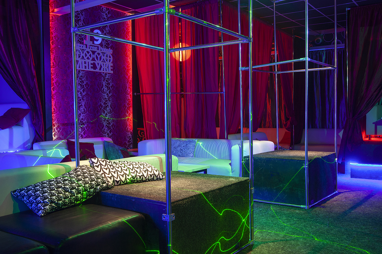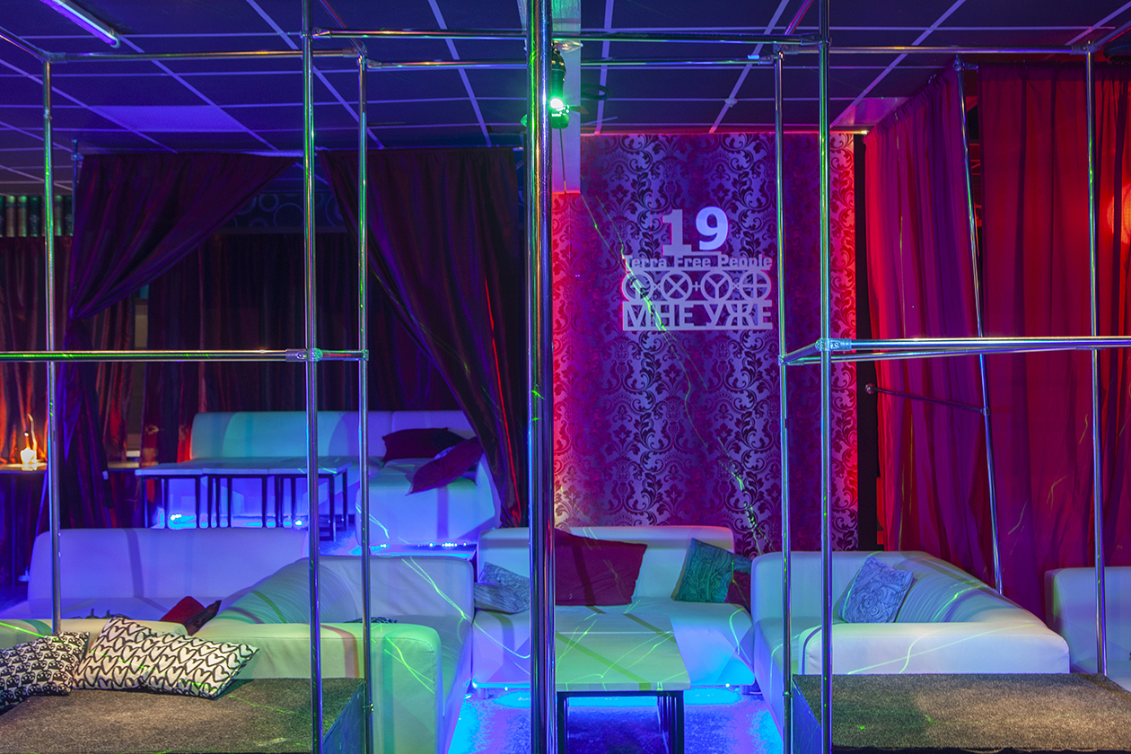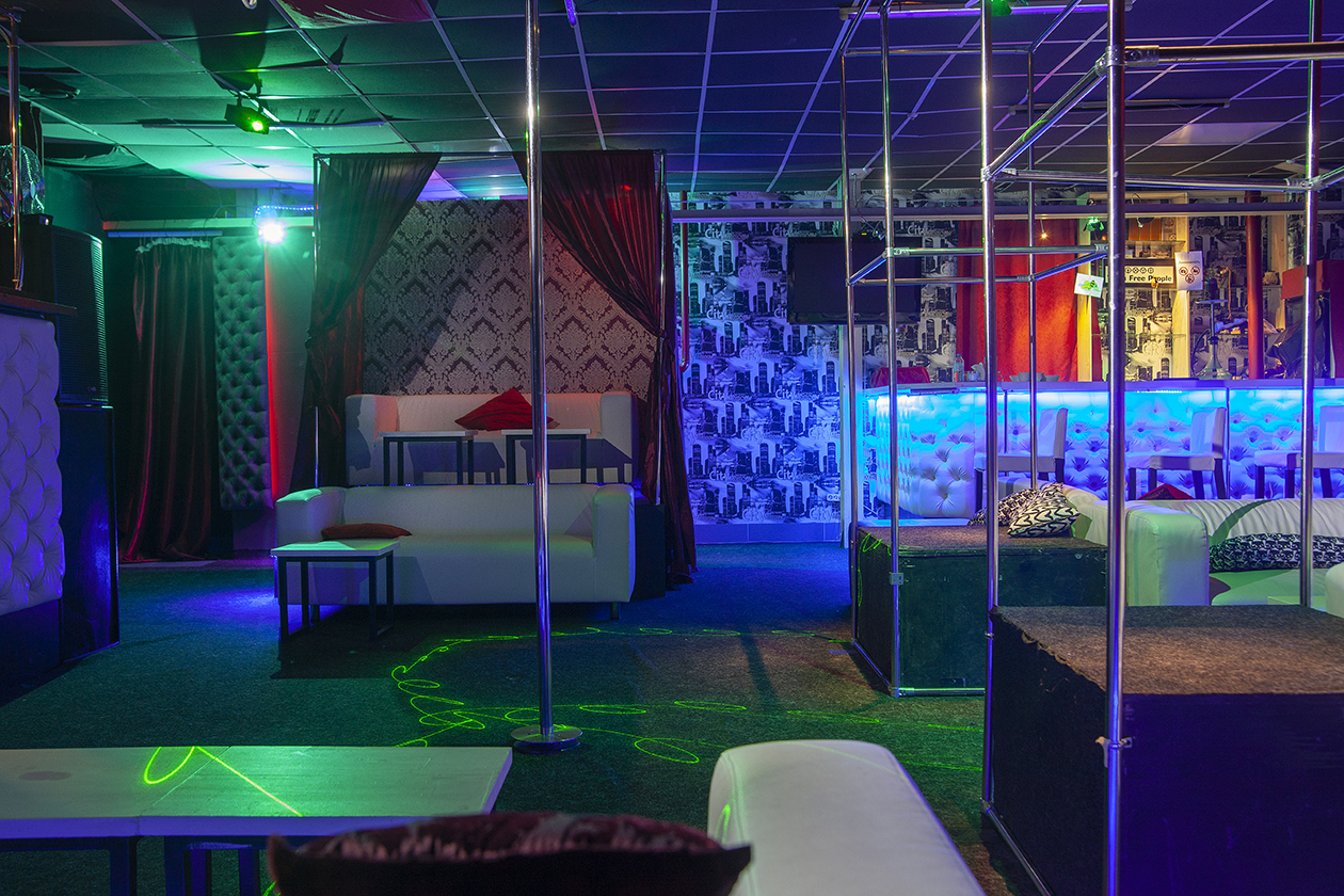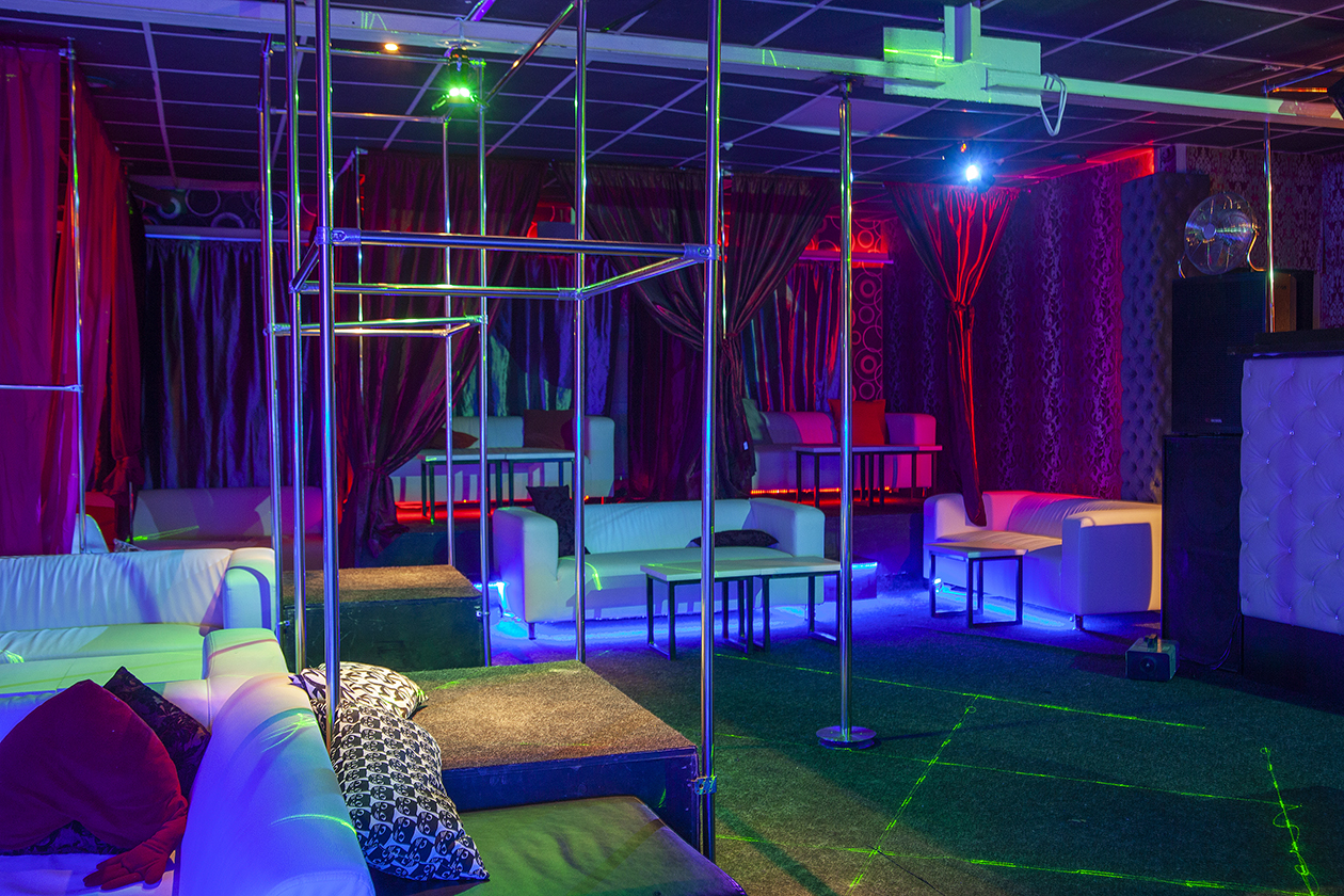 Мы обустроили клуб для вечеринок самостоятельно. Внутри находится большой зал с диванами и баром, а также конструкциями для танцовщиц, которых мы зовем на встречи. Также в пространстве есть несколько приватных комнат, в каждой из которых установлена душевая кабина.