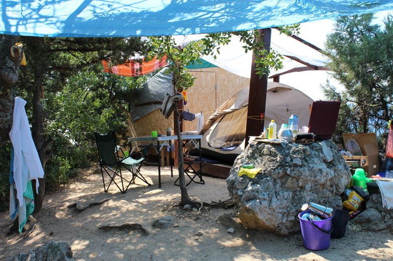 В Крыму кемпинги на берегу моря всегда пользуются популярностью. Одно из таких мест находится в поселке Любимовка под Севастополем . Палаток здесь немного, отдыхающие чаще располагаются в крохотных домиках с удобствами на улице, зато есть горячая вода, впрочем, есть корпус и для комфортного проживания.
