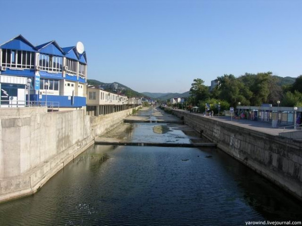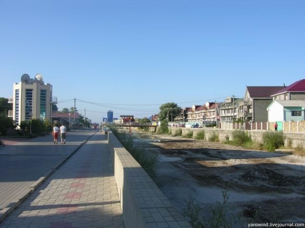 Дорога вдоль русла ведет на пляж и является местным Арбатом – здесь стоят кафе, сувенирные лавки, вечерами совершаются променады.