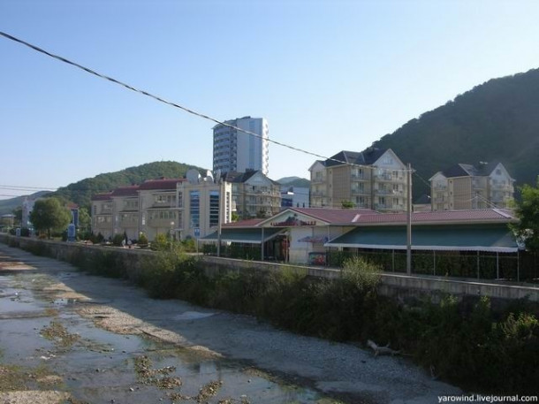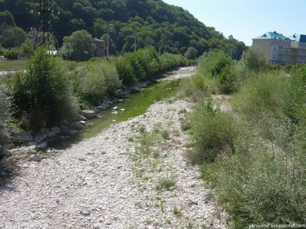 Прямо по центру поселка проложено бетонное русло, по которому весной и после дождей течет река. К осени она полностью пересыхает.