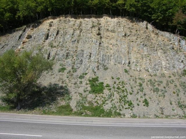 Вдоль дорог много обнажений с вертикальным залеганием пластов