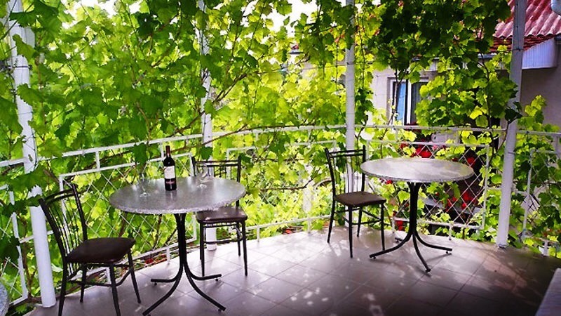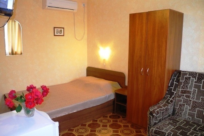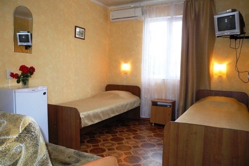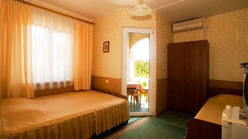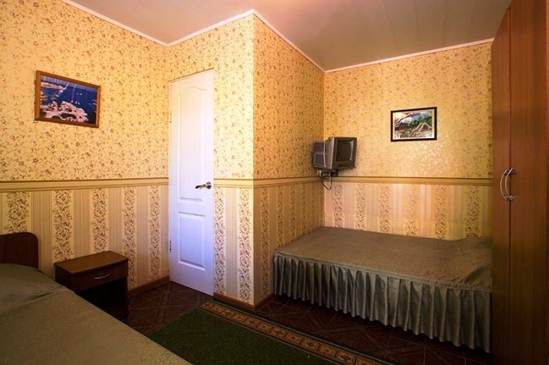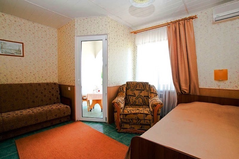 Трёхместный номер на втором в номере : две односпальные кровати ,диванкровать,шкаф, тумбочка, холодильник, телевизор, кондиционер, удобства .Номер выходит на виноградную беседку