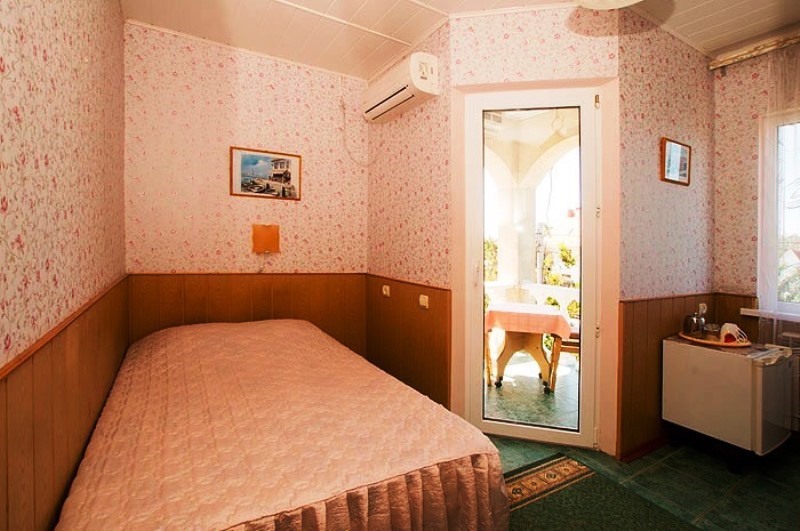 Двухместная комната на втором этаже.В комнате имеется необходимая мебель, телевизор,холодильник,кондиционер и санузел.Комната выходит на индивидуальный балкон.Вид с балкона на цветущий розарий.
