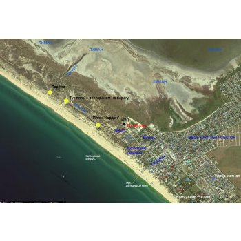 Ездить на свободные пляжи и на рыбалку нужно за желтые обозначения или между ними! Это отдаленные пляжи! От Уютной в 15 году ездил рейсовый автобус до Тортуги. Если будите ездить на своей машине, то между НИКО и Волеградом (спорт комплекс где тренируется женская олимпийская сборная по волейболу) находится КПП, где взымают типа рублей 200 за въезд на косу. Скажу честно, с этих денег толк есть! Я тут весь берег знаю, так раньше было очень грязно, так как годами там не убирал ни кто! Сейчас туда даже мусорные машину доезжают.