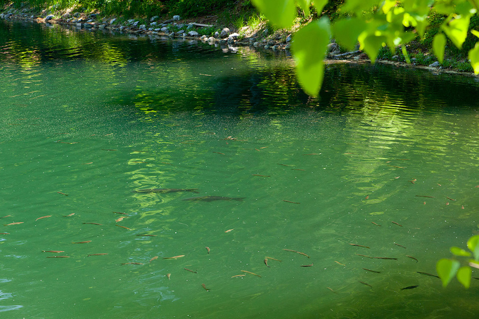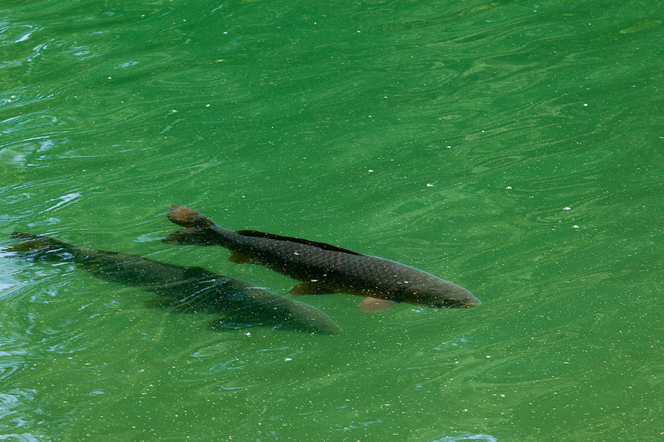 Так же поразило обилие рыбы в Изумрудном. Плавают огромные стаи (десятками) малька белого амура. Именно белого амура, эт я выведал у местных работяг. Мальки такие хорошие до полукилограмма наверное.А порой встречаются и вовсе огромные экземпляры.