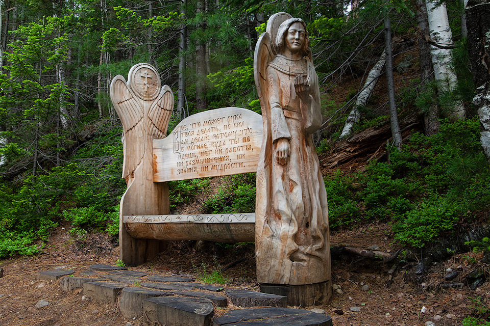 По дороге к часовне наткнулись на вот такую вот скамейку. Очень красивая резьба. Руки, лица, детализация — трогает.