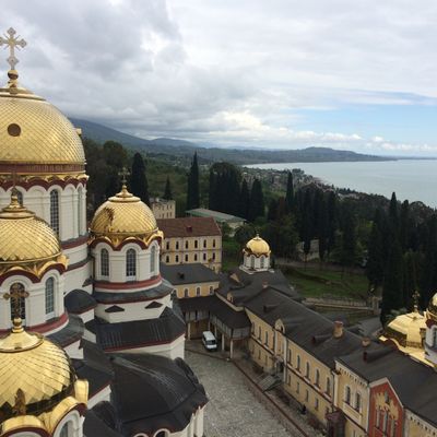 Главная религиозная достопримечательность Абхазии - Новоафонский мужской монастырь Симона Канонита сияет куполами на склоне Афонской горы.