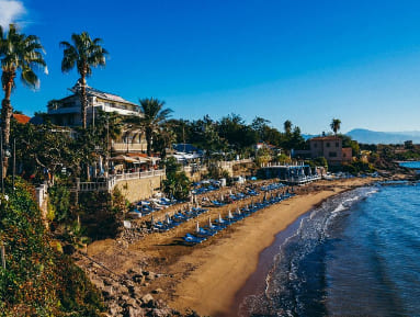 В самом Сиде – два песчаных пляжа, разделенных мысом с храмом Аполлона. Оба отмечены Голубыми флагами, но очень разные. Западная часть более многолюдная, восточная – уединенная. На Восточном пляже баров и магазинов нет, территория поделена между пляжными клубами.