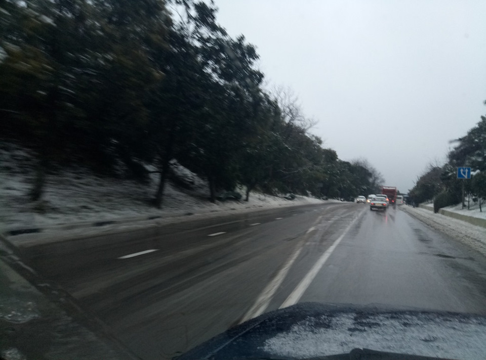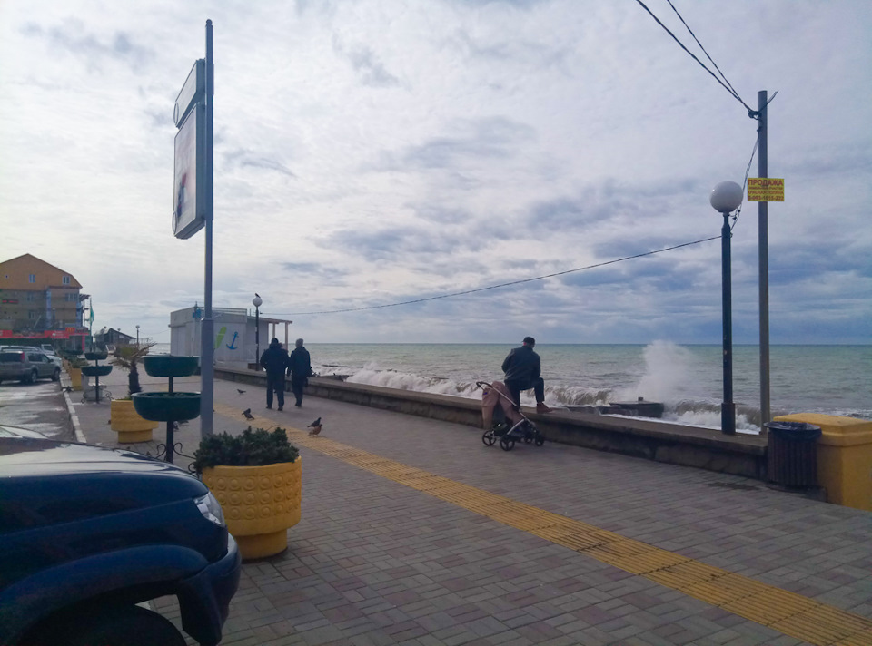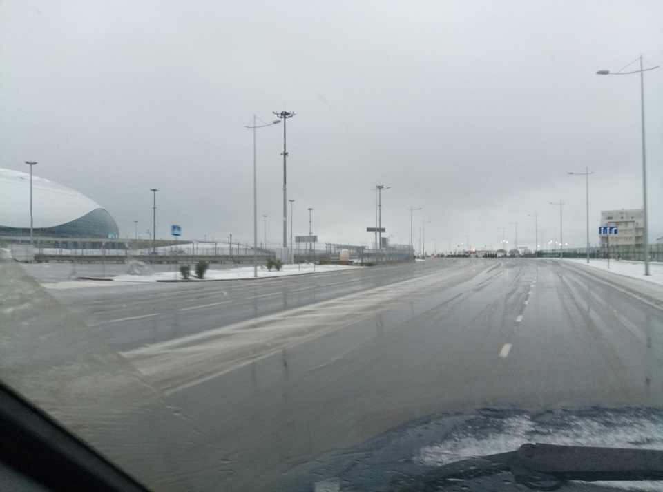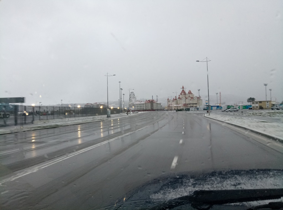 Это Адлер, улица Ленина. Вы Адлер видели или представляли таким? Мокрая снежная каша на асфальте. +1 и сильный ветер. На море шторм.