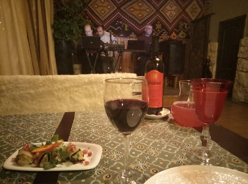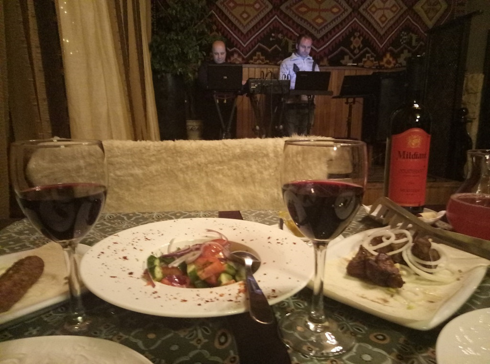 На этот раз я без руля. Можно и вино грузинское продегустировать. Вино неплохое, но скорее всего сильно переоценено в денежном выражении. Салат и мясо безупречны на мой скромный вкус.