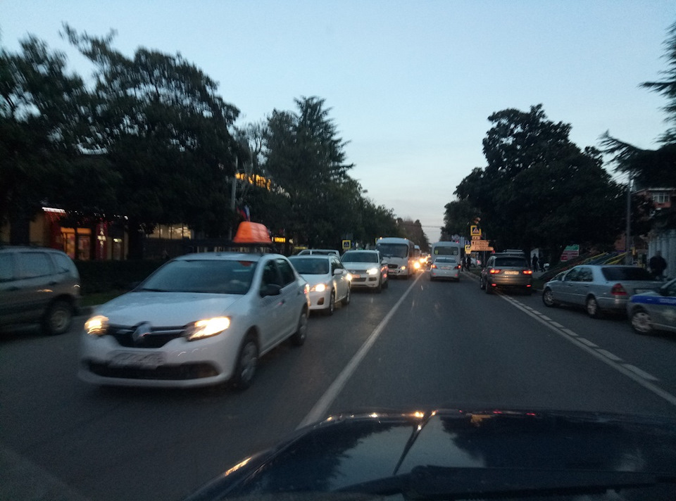 Адлер. Улица Ленина. Пробка по встречному ряду на километр примерно. Виноват светофор на углу пр. Ленина и ул. Ромашек. Он не работал все дни, пока мы были в Адлере.