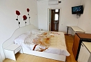 Двухэтажное здание гостевого дома, выстроенное в стиле приморской виллы, занимает небольшую благоустроенную территорию. Отель предлагает туристам комфортабельные номера категории Стандарт или размещение в просторном 6-ти местном доме. В каждой комнате есть телевизор, кондиционер, холодильник, большая двуспальная кровать, а также собственная ванная комната.