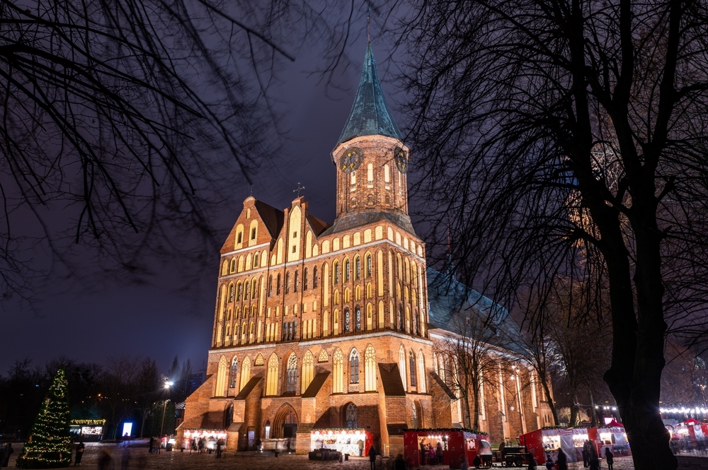 Остров Канта. Я начала маршрут со знаменитого острова в центре Калининграда. Здесь расположен главный символ города — Кафедральный собор. В нем находится музей Иммануила Канта, а неподалеку и могила немецкого философа. В начале декабря музей уже украсили к Новому году, а во дворе поставили большую елку. Глядя на снегопад сквозь готические окна собора, было особенно приятно знакомиться с идеями знаменитого кенигсбержца.