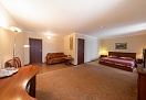 Двухместный номер с двуспальной кроватью, санузлом с дешевой кабиной, феном, телевизором, корпусной мебелью и диваном, телевизором, холодильником.