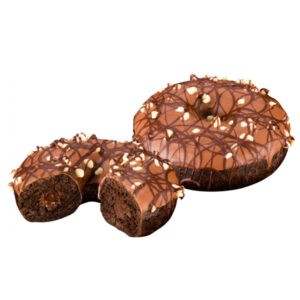 Донат из дрожжевого теста округлой формы с гладкой округлой поверхностью с начинками из темного шоколада и молочного шоколада, украшенный молочным, темным и белым “Бельгийским” шоколадом. Слегка сладкий, легкая нота какао. Вес 67 гр. Срок годности 3 дня.