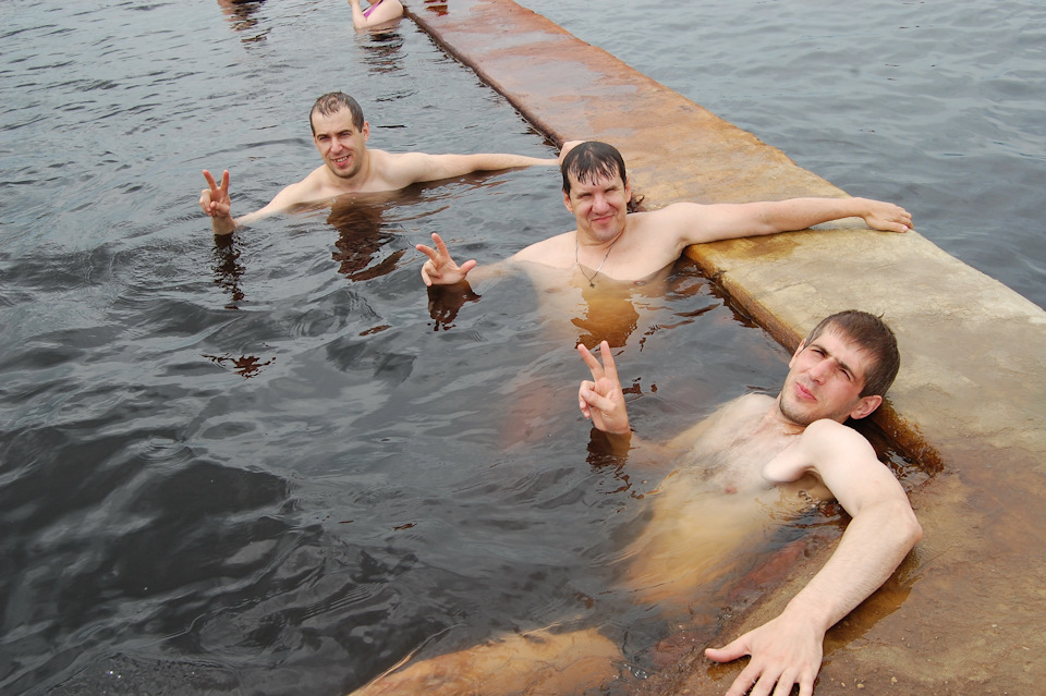 5. Ну а мы все плюхаемся в воду и кайфуем. Это наш мужской состав. Настроение отличное, погода пасмурная, идёт дождь, а мы лежим и наслаждаемся жизнью.