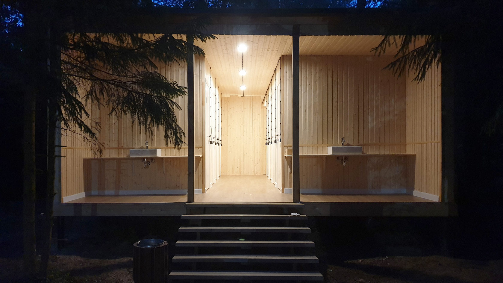 В жилой зоне оборудованы отдельно стоящие теплые модули с санузлами и душевыми. За каждым номером закреплен свой индивидуальный блок.