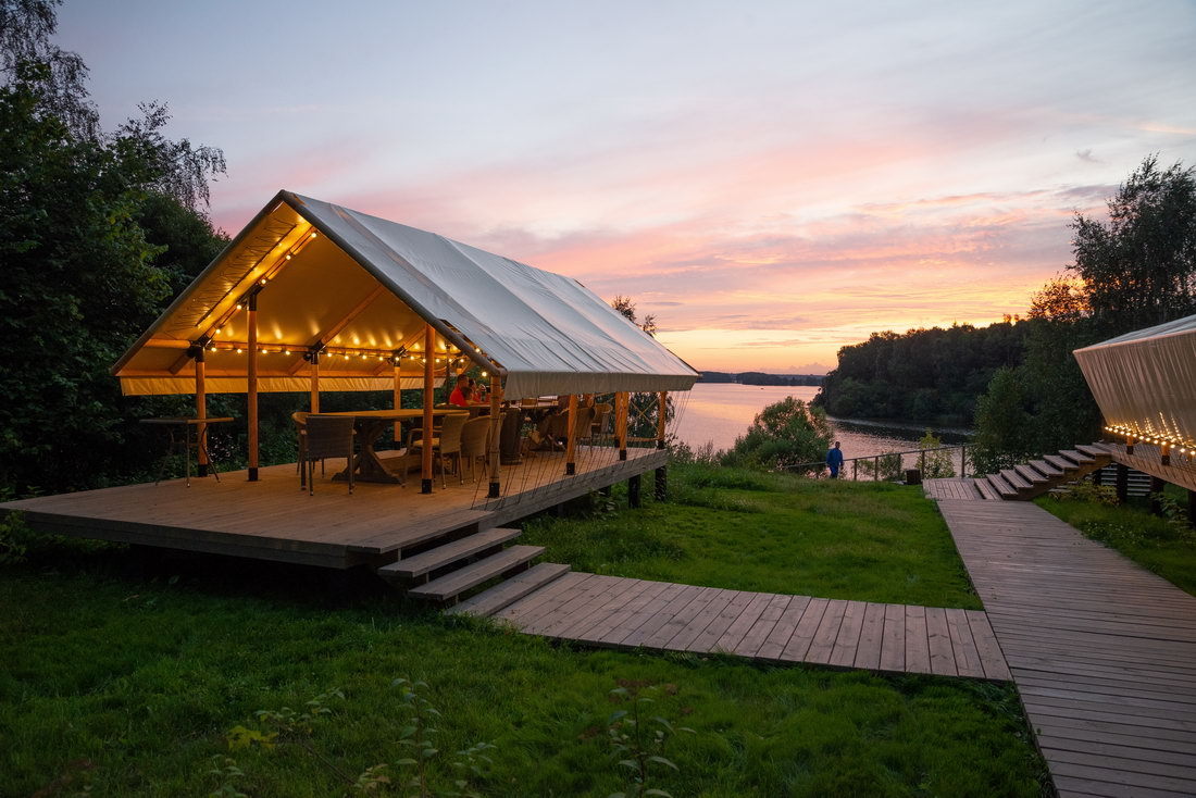 У нас потрясающие закаты. Смотреть на них можно, сидя на террасе палатки, с бокалом вина в руке. Или ужинать в нашем панорамном ресторане. Вечером - посидеть возле костровой чаши. Или прогуляться по территории глэмпинга – вечером он подсвечивается гирляндами и свечами.