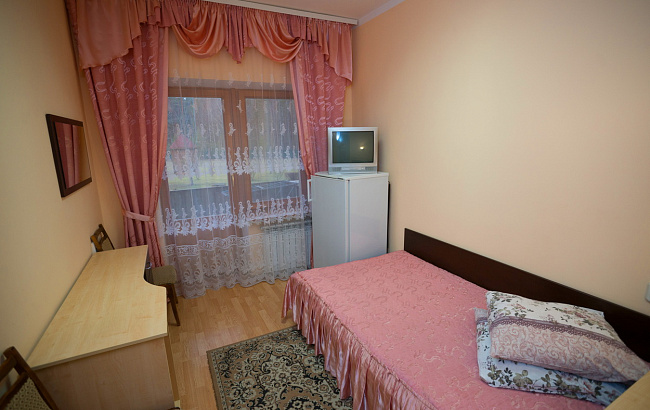 В номере: полуторная кровать, мини-холодильник, телевизор, санузел с душем, фен, балкон.