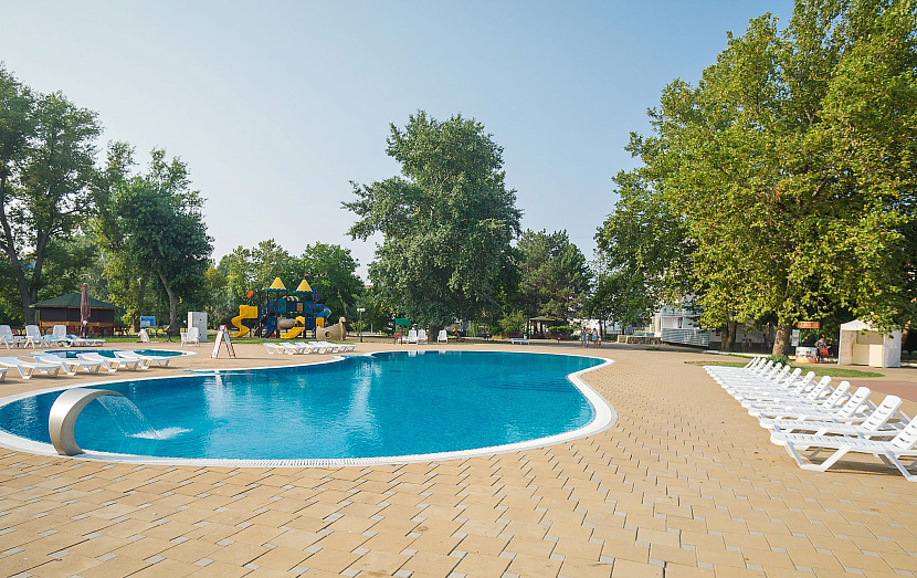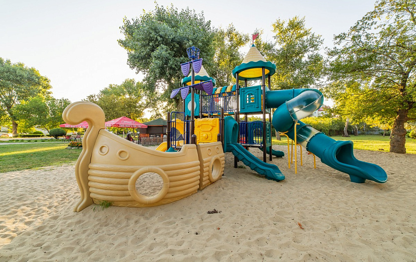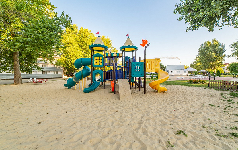 Для детей есть отдельный бассейн на 35 кв. м и глубиной 0,7 м, игровая площадка-городок, детская комната с воспитателем, прокат велосипедов и колясок, стульчики в зале питания, кроватки-манеж, детская анимация.