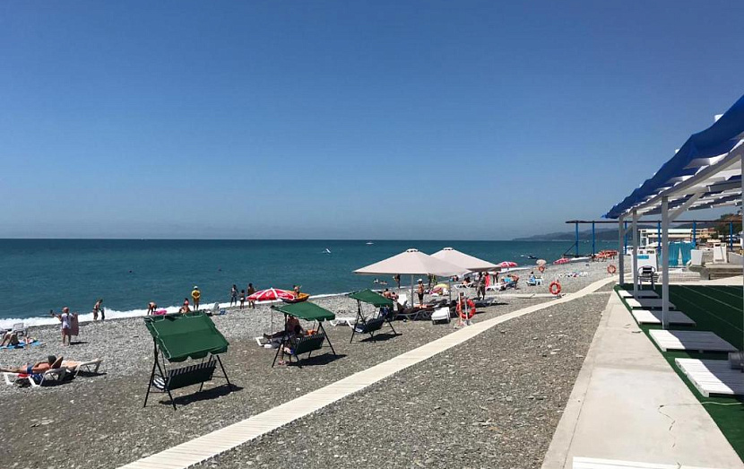 Собственный песчано-галечный пляж расположен в 300 метрах от пансионата. Пляж оборудован кабинками для переодевания, туалетами, душевыми, лежаками, навесами, зонтами и шезлонгами.