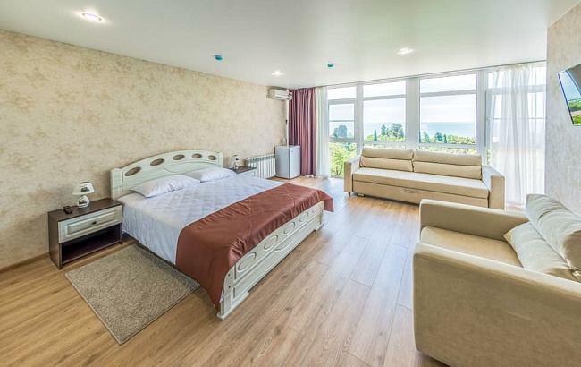 Мы ждем Вас в любое время года!Номерной фонд пансионата представлен в одном комфортабельном корпусе. Емкость которого составляет 115 номеров, каждый из которых оборудован всем необходимым для благоприятной обстановки: телевизор, холодильник, кондиционер. Гостям предлагается одноместное или двухместное размещение. Дополнительные места от 1 до 3 человек предоставляются в зависимости от категории. Интерьер выполнен в классическом стиле, вид из окон как на горы, так и на Чёрное море. Пансионат имеет автономную систему водоснабжения и кондиционирования.