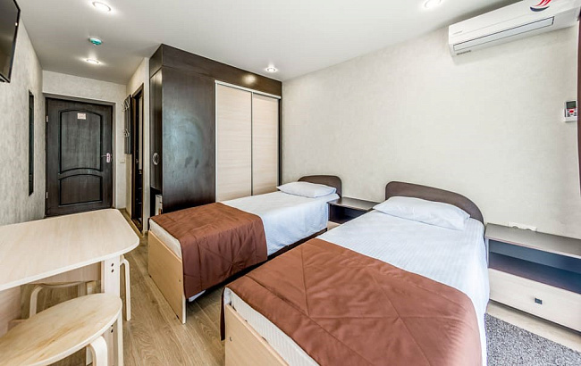 шкаф, тумбочки, кровати односпальные, стол, вешалка, душевые принадлежности, отдельный входТехника: