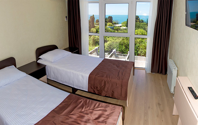 В номере: две односпальные кровати или одна двуспальная кровать, телевизор, кондиционер, мини-холодильник, Wi-Fi, санузел с душем, фен (по запросу), комплект полотенец. Вид на море или во внутренний дворик.