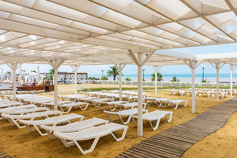 5-километровая пляжная зона Gamma Sirius, усыпанная мелкой галькой, оборудована кабинами для переодевания, туалетами и душевыми кабинами, лежаками, зонтами для защиты от солнечных лучей и навесами-аэрариями, велодорожками и дорожками для маломобильных граждан. Пляж отличается высокой чистотой за счет удаленности от железной дороги. Безопасный отдых обеспечивают медицинские пункты и станции спасателей. Для отдыхающих с ограниченными возможностями установлен пандус. Для юных гостей предусмотрено место для купания на мелководье, вблизи станции спасателей, а также детский лабиринт и водная горка. Взрослым отдыхающим доступны прогулки на катамаране, водном скутере и банане, а также парасейлинг.
