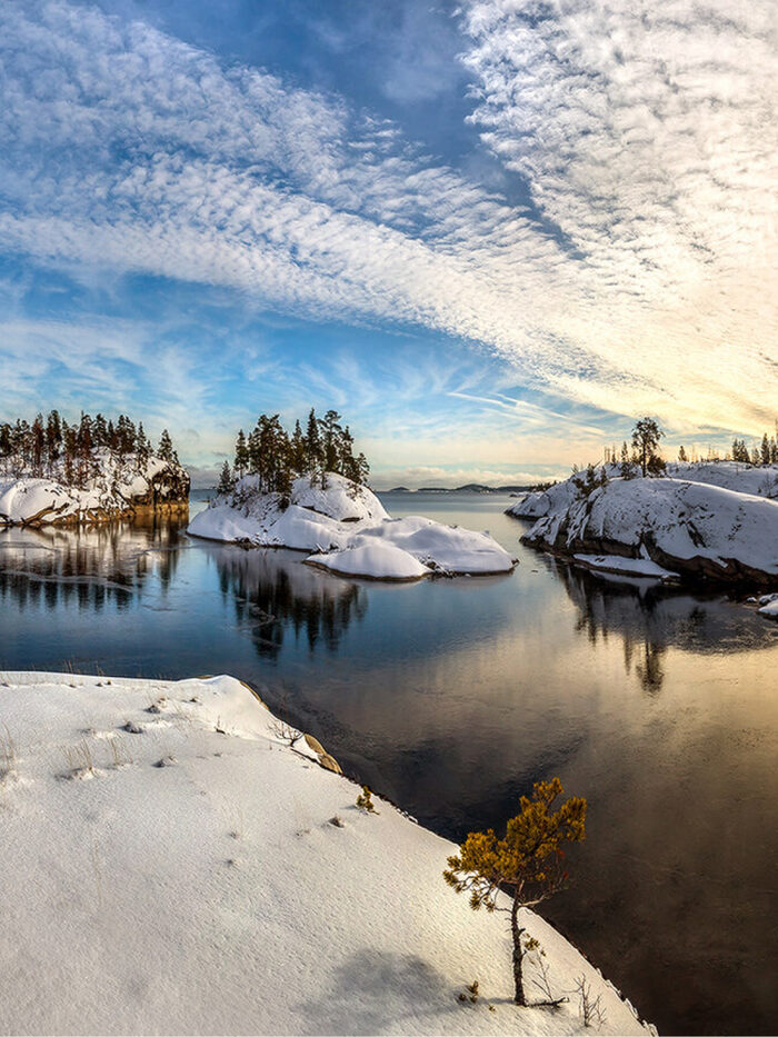 Зима снежная и красивая. В основном до −20°С, но бывают и 30-градусные морозы. Это высокий сезон — многие приезжают в Карелию на базы отдыха и встречают Новый год. Зимой развлечений не меньше, чем летом! Почитайте, как отдохнуть зимой в Карелии.