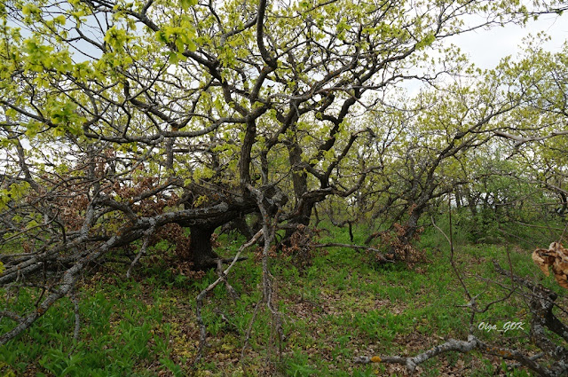 Во-первых, на верху растут дубы не свойственной им формы. Они словно, отплясывают "Джигу", причудливо извиваясь каждой своей веточкой. Форма каждого дерева неповторимо индивидуальна, что не дерево, то- творение безумного художника.