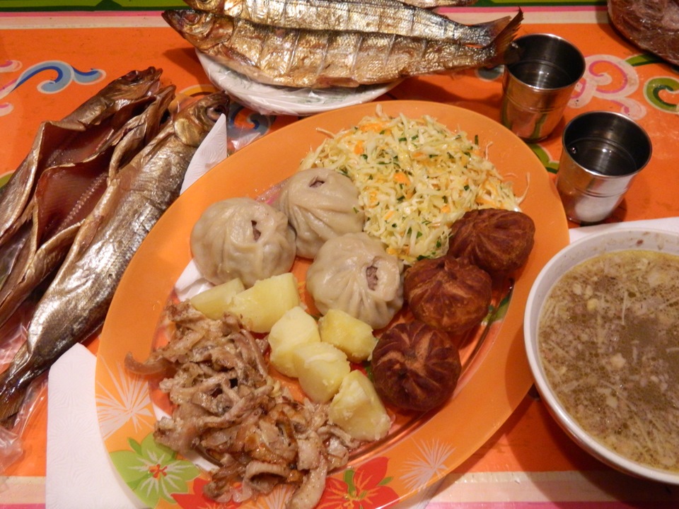 Обед кочевника : хаш, йен хото, буузы, хошур, картофель и капустный салат. Омулёк свой, с соседнего Байкала.