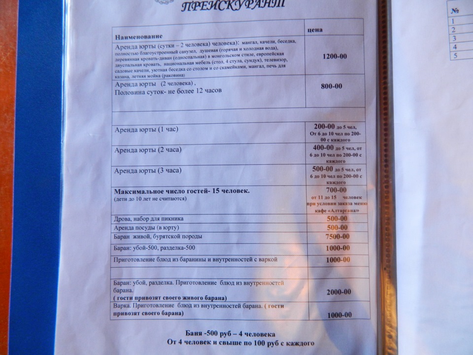 Аренда юрты — 600 рублей за сутки (детям до 14 лет скидка 50%), аренда места под свою палатку — 100 рублей.