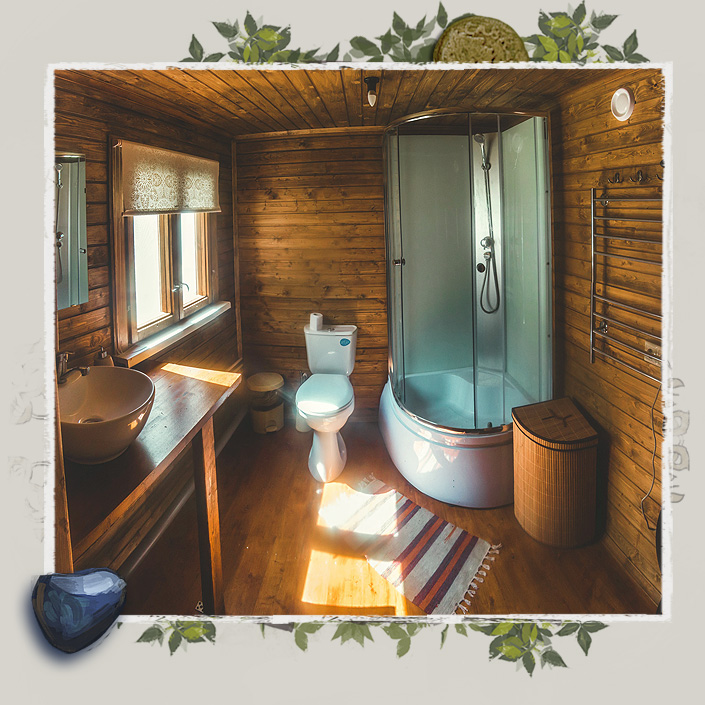 Несмотря на то, что мы кемпинг, все юрты оборудованы стильными и просторными санузлами. Тут есть всё необходимое для гигиены: