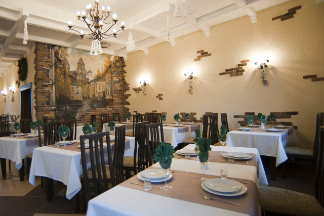 Ресторан находится в отдельном знании и является неотъемлемой частью гостиницы, вмещает 70 персон. Ресторан может по праве гордиться меню с широким выбором блюд старобелорусской и европейской кухонь. Изысканным угощением для дорогих гостей станет дичь, приготовленная шеф-поваром по оригинальным рецептам. Находясь в ресторане, вы насладитесь теплом и уютом. Интерьер оформлен в классических традициях. Истинным украшением зала является фреска с видом городского пейзажа.