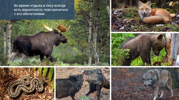Всегда есть возможность во время отдыха в лесу повстречаться с его обитателями: медведем, лосём, диким кабаном, змеёй, лисой и волком. Как правило, дикие животные не ищут встреч с человеком, если он сам такую встречу не провоцирует. Однако, можно повстречаться и со зверем, переносчиком бешенства (обычно им страдают лисы). Такие животные не боятся выходить к человеку.