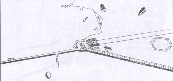 Рисунок 4. Деталь Генерального плана — 1722 года. (Юго-западная оконечность Дубковской косы с отрезком дамбы гавани, зданиями и прудом).