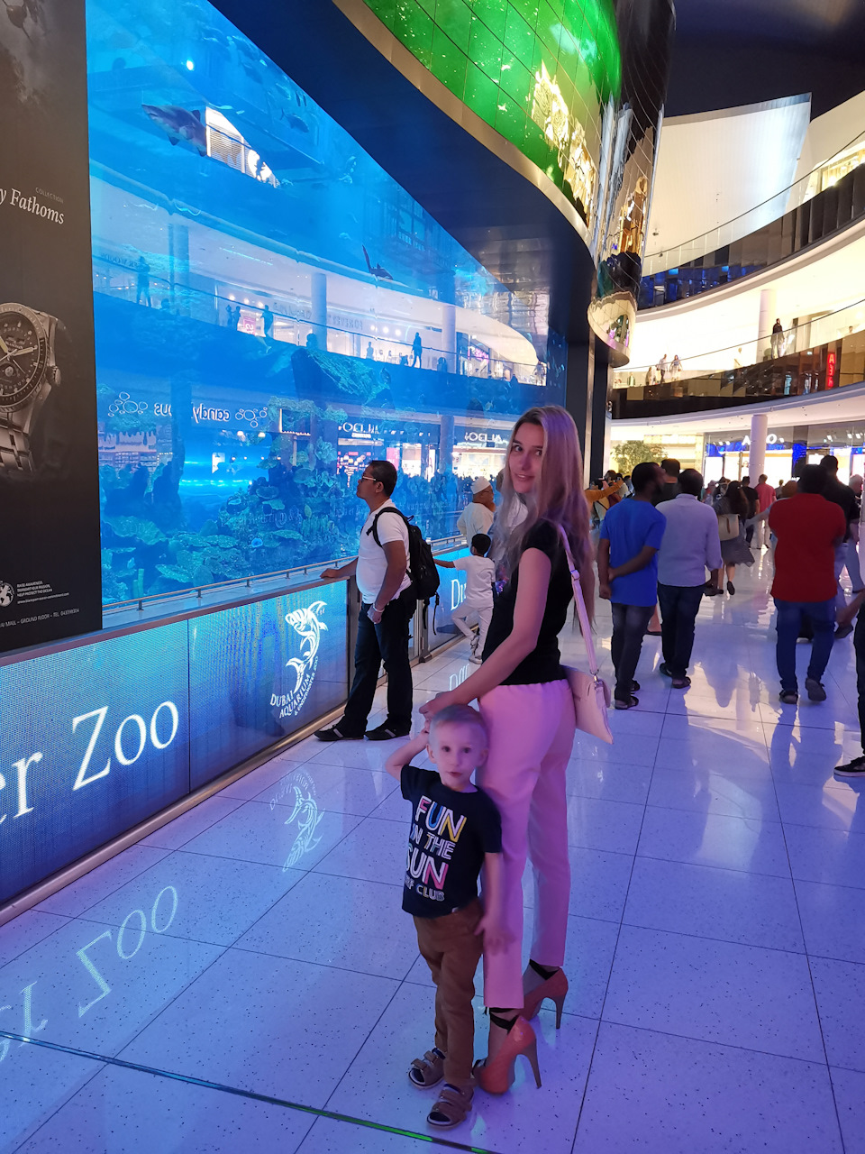 В главном торговом центре Дубай Молл, который является одной из достопримечательностей Дубая, есть океанариум, вход платный. А сам аквариум проходит через весь торговый центр. Вы можете любоваться с любого этажа на тонны воды и большое количество рыб, акул, скатов, проплывающих мимо вас. Торговый центр открыт с 10 часов и до полуночи. Подробнее про Аквариум Дубая мы рассказывали в этой статье →