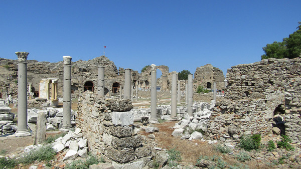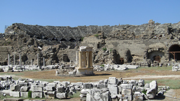 В Сиде мы ехали из Анталии, не доезжая до Манавгата, пересели на маршрутку, и не совсем понимая, где выходить, внимательно вглядывались в проплывающий за окном пейзаж. На каждой остановке пассажиры лениво покидали микроавтобус, кстати, в Турции они называются долмушами, мы ехали дальше, у меня даже начало закрадываться сомнение, туда ли мы едем. Но вот после очередного поворота стали появляться непривычные взгляду строения, руины, колоннада, уходящая в сторону от дороги, необычного вида ворота, да и много еще зданий, названия которым я дать на тот момент не могла.