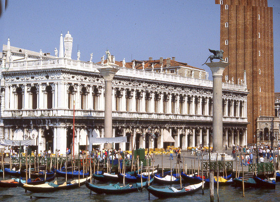 Фасадом к Дворцу Дожей обращена Библиотека Сансовино. Это старинная библиотека Венеции. Чтобы попасть внутрь нужно предварительно позвонить по телефону и получить специальное разрешение. Главным сокровищем библиотеки является географическая карта 1459 года, которая была нарисована монахом монастыря Святого Христофора.