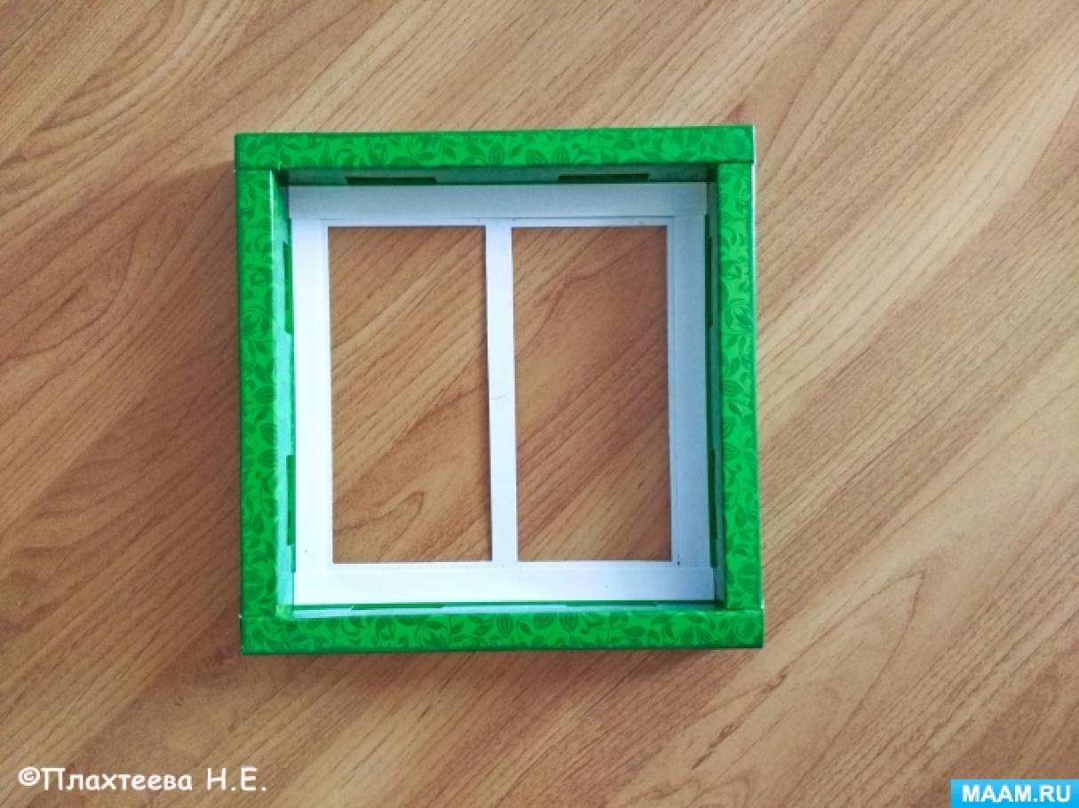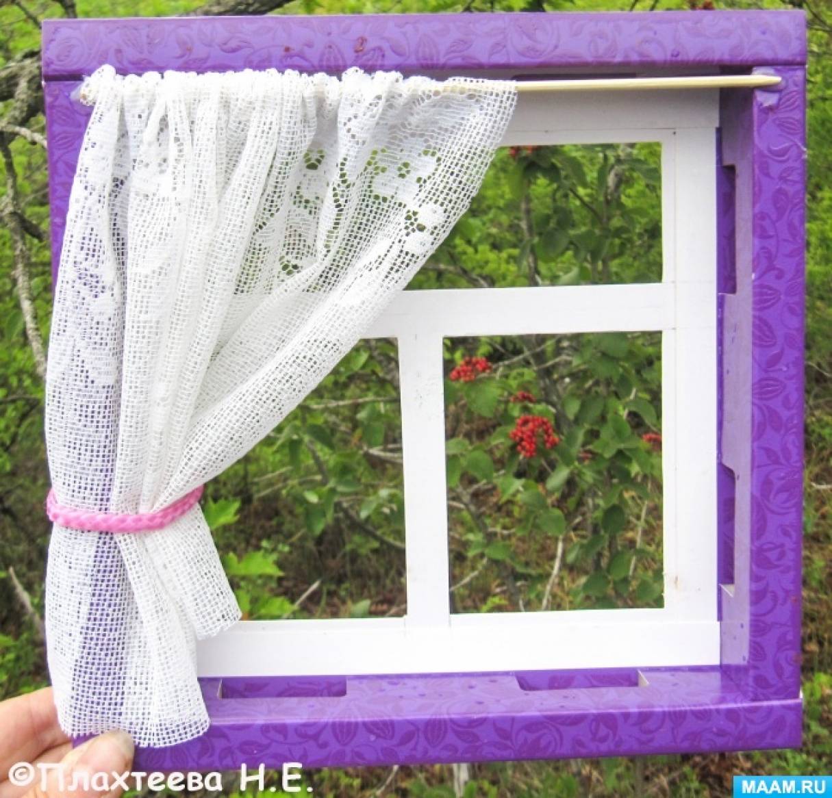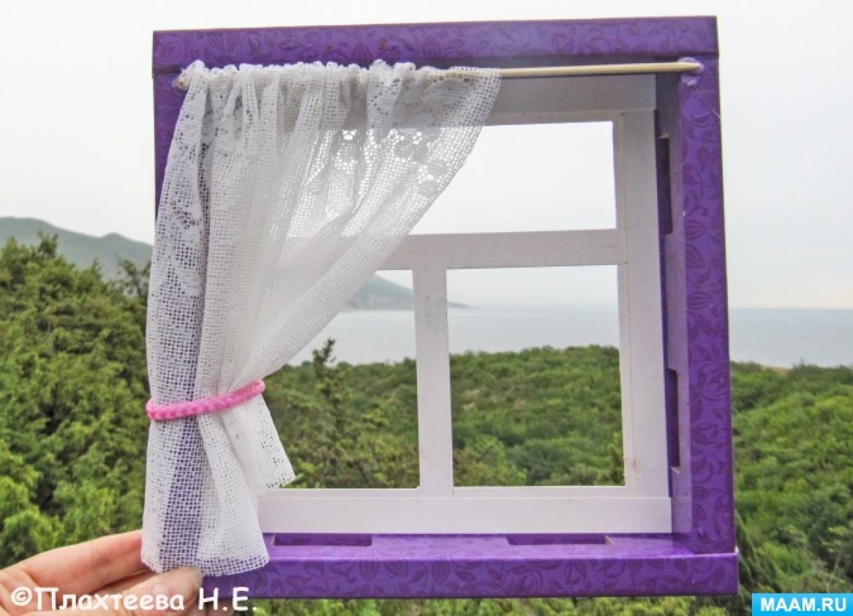 С помощью клеевого пистолета закрепить полученную занавеску в верхней части окна. Получилось настоящее окно с карнизом и шторой на нём. Теперь штора может двигаться